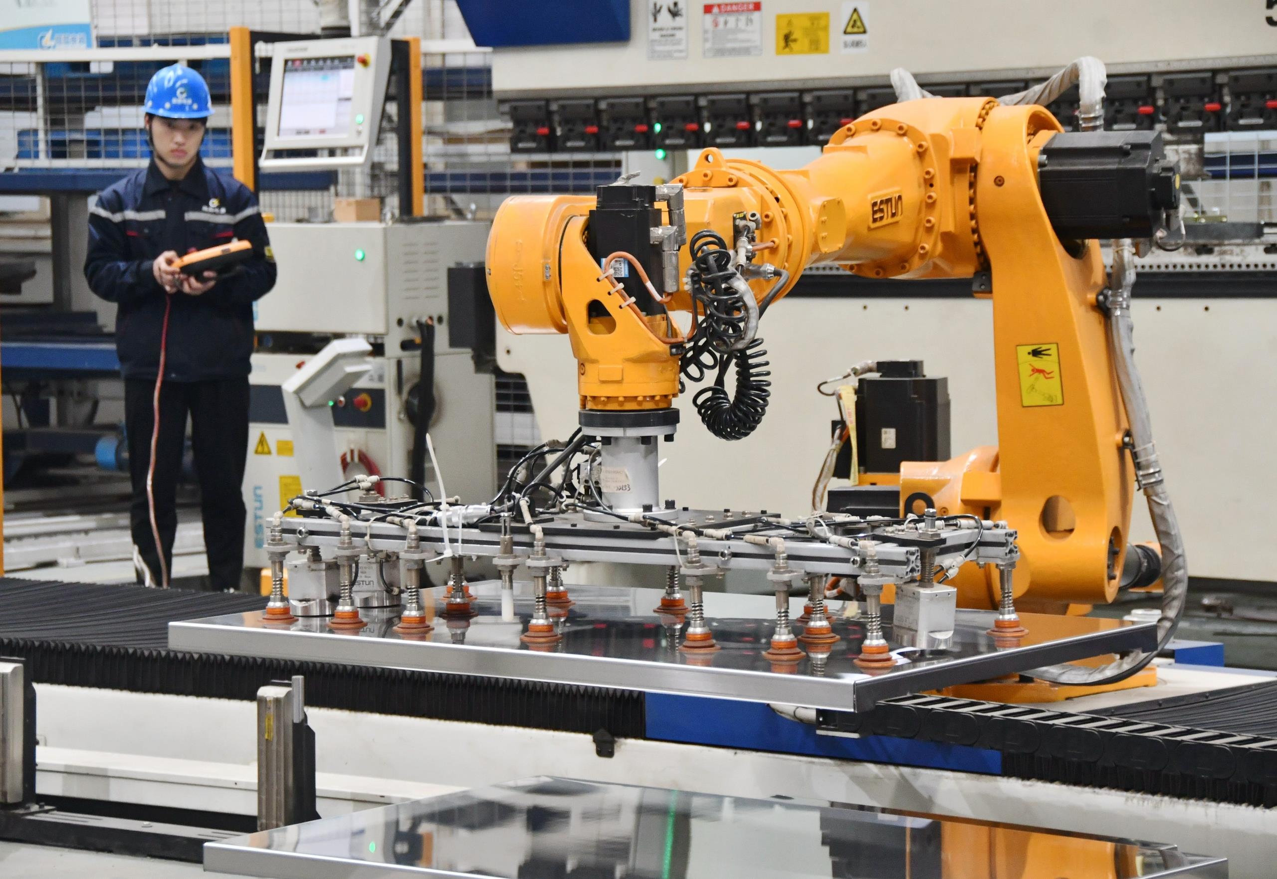 △2025年2月21日,河北邯郸永年区工业园区的一家企业,工人正在操控工业机器人作业。